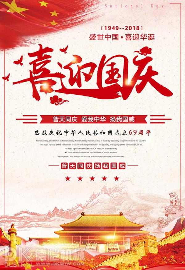 秋高氣爽國慶節,舉國歡慶吉祥到,張燈結彩焰火舞,人潮如涌街巷滿,紅旗獵獵隨分飄,國泰民安幸福來。德愷機械全體員工祝大家國慶節快樂!